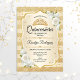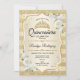 Dourado convite para comemoração da Quinceanera branca. Apresenta faixas, fontes de script, rosas brancas, tiara e confetti. Design clássico com ouro falso brilhante. Perfeito para uma elegante celebração de glam.