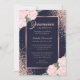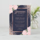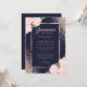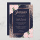 Belo convite de festas floral de ouro azul e rosa com quinceñera, com rosas cor-de-rosa pinceladas e confete de ouro rosa.