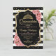 Dourado convite para comemoração de Quinceanera rosa-preto. Apresenta faixas, fontes de script, rosas rosa-pinceladas, tiara e confetti. Design cor-de-rosa com falso brilho. Perfeito para uma elegante celebração de glam.