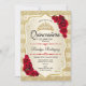 Dourado convite para comemoração de Quinceanera. Apresenta faixas, fontes de script, rosa vermelha, tiara e confetti. Design clássico com ouro falso brilhante. Perfeito para uma elegante celebração de glam.