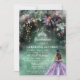 Um convite encantado à quinceañera, com uma ilustração feita à mão de galhos de árvores com vegetação exuberante, silvestre e folhagem rica, feita digitalmente com ouro (é um efeito, não uma folha real!), sobre um fundo verde esmeralda, assim como uma princesa de lavanda, vestindo uma tiara. Perfeito para uma queda de primavera ou quinceañera de inverno com tema de floresta encantado. Um convite elegante e moderno para um conto de fadas quinceañera, é o convite perfeito para aqueles que amam o cenário da floresta de conto de fadas, o tema da floresta de fadas ou do jardim de fadas e o verde esmeralda. Personalize completamente cada linha de texto.