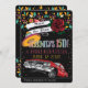 Colorida Quinceañera "Salve a Data" com decorações florais tipográficas mexicanas e confete de ouro nas fronteiras, apresentando uma bela ilustração de um abaixador vermelho, uma adorável rosa vermelha, e um sombrero amarelo sobre fundo preto.