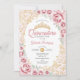 Convite para comemoração da Quinceanera de ouro rosa. Recursos, fontes de script, borboletas douradas, rosas de aquarela e tiara. Perfeito para uma elegante celebração de glam estilo princesa. Personalize com seus próprios detalhes. Impressos convites Zazzle ou modelo de impressão digital instantânea para download.