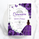 Convite para comemoração de Quinceanera roxa, prata e branca. Possui uma morena em vestidos de capa de bola, fonte de script, borboletas prateadas, rosas roxas e tiara. Perfeito para uma elegante celebração de glam estilo princesa. Personalize com seus próprios detalhes. Impressos convites Zazzle ou modelo de impressão digital instantânea para download.