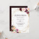 Este convite de aniversário floral geométrico de ouro da quinceñera é perfeito para uma celebração de aniversário moderna. O design apresenta buquês de flores elegantes, verdes, esbranquiçados, roxos, vermelhos e burlões desenhados à mão, adorando quadros geométricos dourados, classe inspiradora e beleza.