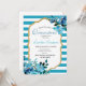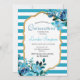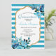 Elegant invitation for a debutante party with blue stripes and gold glitter details. Romantic design with an illustration of blue flowers.