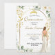 Elegant invitation for a debutante party with white and gold glitter details. Romantic design with an illustration of white drees.