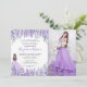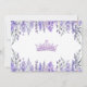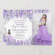 Convite Floral de Quinceañera Tiara Watercolor. Esta elegante, porém caprichosa design é perfeita para celebrar uma Quinceañera especial. A frente apresenta uma menina lindamente ilustrada em um brilhante vestido roxo com uma tiara correspondente, agora colocada no lado esquerdo, cercada por delicadas flores de lavanda aquosa e folhas verdes. Os detalhes do convite são exibidos em uma mistura de fontes serif clássicas e tipografia de script elegante para um eterno e aparência sofisticada. No lado direito, há um espaço dedicado para adicionar uma foto da aniversariante, fazer este convite ainda mais pessoal e memorável. As cores da fonte podem ser personalizadas para criar um design mais colorido ou vibrante para se adequar ao seu tema. As flores moles de aquarela têm um toque vibrante, e se você quiser uma aparência mais brilhante, basta ajustar a camada transparente para obter uma aparência mais vívida. O verso do convite continua o tema floral com flores lavandas e uma princesa tiara, criando um design coeso e charmoso. Disponível como um convite impresso ou como um download digital, dando a você a flexibilidade de impressão em casa, enviar digitalmente ou ter impresso profissionalmente para sua celebração com a Quinceañera!