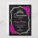 Convite para comemoração da Quinceanera, cor-de-rosa-prata. Apresenta fontes de script, rosas rosa-quente, tiara e confetti. Design cor-de-rosa com falso brilho. Perfeito para uma elegante celebração de glam.