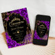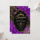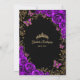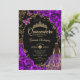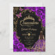 Convite para comemoração de Quinceanera, preto, roxo e ouro. Apresenta uma garota morena em vestidos de capa de bola, fonte de script, borboletas de ouro, rosas de aquarela e tiara. Perfeito para uma elegante celebração de glam estilo princesa. Personalize com seus próprios detalhes. Impressos convites Zazzle ou modelo de impressão digital instantânea para download.