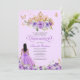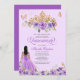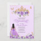Convite de quinceanera em tons lilás e lavandas de púrpura com borboletas de ouro e uma bela tiara e uma garota de vestido de bola. Visite o compro para obter mais variações no tom de pele e combinações de cores