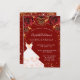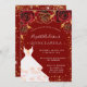Um convite moderno, na moda e glamouroso para uma Quinceañera, festa de aniversário 15. Um fundo vermelho com poeira brilhante dourada falsa, um vestido branco e rosas vermelhas, florais. O nome é escrito com um moderno estilo escrito à mão. Personalize e adicione os detalhes da sua festa.