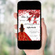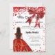 A modern, stylish and glamorous invitation for a Quinceañera, 15th birthday party. A white background with sparkles, a red dress and a red bow. The name is written with a modern hand lettered style script. Personalize and add your party details.