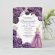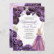 Convite de quinceanera em roxo real e ouro de rosa com vestido elegante. Verifique o compro deste convite com meninas com diferentes cores de cabelo e tons de pele.