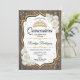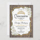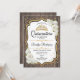 Convite para comemoração da Quinceanera. Apresenta padrão de madeira marrom-escura, rosas brancas, fonte de script na moda, tiara e confetti. Design clássico com ouro falso brilhante. Perfeito para uma elegante celebração de glam.