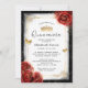 Faça uma declaração ousada e inesquecível com estes convites elegantes da quinceañera, projetados em um dramático esquema de cores vermelho, preto e branco. Perfeito para um 15, doce 16, ou casamento rosa vermelha, este modelo editável permite personalizar o elegante roteiro de caligrafia, texto e detalhes para corresponder ao seu evento especial. O design real apresenta rosas vermelhos vívidos de aquarela, colocados contra um pergaminho branco macio de aquarela, emoldurado por uma borda de ouro de ornamentado para um talho de vintage. Uma delicada coroa dourada / princesa tiara e borboleta esparsa confetti adiciona um belo toque de cinzeiro e charme festivo. No verso, há espaço para incluir palavras extras ou uma bela foto de Mis Quince Años sobre rosas de aquarela pretas. Se você quiser torná-lo realmente seu, você pode até trocar as borboletas, a coroa e os elementos florais por opções de cor alternativas. Com sua rica paleta e toque de glamour, esse convite de modelo também é perfeito para um tema de mascarada ou festa mexicana romântica. Categoria: 15/16/15 convites elegantes de aniversário para quinceanera; convites para quinceanera floral; e convites para marmelos góticos. Cores do tema quinceanera preta e vermelha: vermelho vivo, burgundy, marrom, vermelho escuro, ouro de champanhe amarelo, preto e branco.
