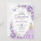 Convite de celebração de Quinze Anos lilás roxo, prata e branco. Características, menina loira em vestido de baile, fonte de caligrafia, borboletas, rosas em aquarela e tiara. Perfeito para uma celebração glamorosa de estilo princesa elegante. Personalize com seus próprios detalhes. Convites Zazzle impressos ou modelo digital para impressão instantânea.