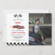 O tema do carro de corrida não pode me dar conta de que sou três cartazes de aniversário de 3 anos de carruagem com ilustração de um carro vintage vermelho com chamas.