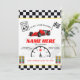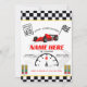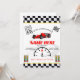 Um vibrante convite de aniversário, um carro de corrida vermelho aparecia com destaque. O carro está no meio do chão, posicionado como se estivesse em movimento, com pistas de pneus apontando para ele. Um indicador verificado paira acima do carro e um sinal de limite de velocidade mostrando "SPEED LIMIT 65" está no canto superior esquerdo. O fundo é predominantemente branco com um padrão de pistas de pneus que formam um caminho de viragem na direção do carro. Um padrão de verificação preto e branco borda as bordas da imagem, criando um tema de corrida. Disponível como convites imprimíveis ou downloads instantâneos.