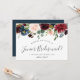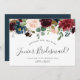 O cartão de apresentação do partido floral Chic apresenta uma fronteira superior de burgundy marsala, flores azul-pinceladas e marinhos, com folhagem botânica e verde-limpas. Personalize com seus detalhes de pedido de madrinha júnior (mostrados com "você será minha madrinha jr? Eu não posso dizer que eu não tenho você") em modernos textos escritos à mão e em letras sans serif tradicionais. Convites invertendo a uma joia rica em azul-marinho.