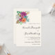 Um convite de casamento com uma composição floral contendo lindas rosas rosa, laranja e branca cercadas por folhas verdes.