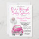 Dirigir através do convite do chá de fraldas com um carro cor-de-rosa fofo e balões em um fundo de ponto rosa e branco. Este drive fofo através do convite do chá de fraldas é facilmente personalizado para o seu evento simplesmente adicionando os detalhes do seu evento.