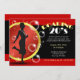 A era é a década de 1920, o tema é a década de 20 itinerantes, e a premissa é o bebendo (água gigante) e ter excelente tempo! Esses convites de festas personalizados são projetados em cores vermelhas, douradas e pretas, com uma silhueta de garanhão e bolhas brilhantes. Cartões de agradecimento Correspondentes (itens vendidos separadamente):