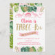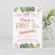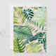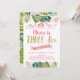 Este adorável convite de aniversário apresenta folhas de aquarela tropicais com embelezamentos de folhas com brilho dourado e dinossauros cor-de-rosa.