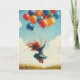 Uma jovem com um vestido azul que flui é levantada no céu por um monte de balões coloridos, seu cabelo vermelho fluindo no vento contra um fundo brilhante e sonhador.