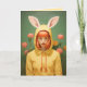 Um retrato surpreendente de uma jovem de cabelo vermelho-claro, vestindo uma capa de chuva amarela com orelhas de coelho no capuz, colocado contra um fundo floral de flores rosa e amarelas. A imagem exumenta um encanto surreal, parecido com um livro de histórias.