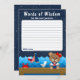 Esta bela e divertida carta de sabedoria apresenta um urso marinheiro náutico num convés de madeira com uma gaivota e um caranguejo. Ao fundo há um pássaro vermelho giro em um veleiro, ondas oceânicas e um marinho azul estrelado céu noturno. O texto combina fontes em negrito e sem serifa para uma aparência na moda e moderna. Isto é perfeito para um chá de fraldas temático náutico.