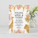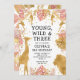 Este terceiro convite de aniversário da "jovem, selvagem e três" safari da selva, com o tema da menina, apresenta folhas falsas de ouro (girafa, leão e macacos), folhagem dourada e rosa da selva, e uma aspersão de confete de ouro sobre fundo branco. Adicione o nome da aniversariante e os detalhes da festa em texto preto. No verso aparece um padrão de quadros coordenadores de folhas cor-de-rosa e douradas.