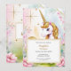 Faça dela um dia especial realmente mágico com este adorável convite de aniversário unicórnio! Apresentando um unicórnio gentil com um brilhante buzinheiro dourado e um sorriso doce, esta design capta a maravilha da infância. O fundo é aspergido com estrelas douradas cintilantes e decoradas com flores pastéis macios, criando um olhar sonhador e encantador. Perfeito para aniversários de meninas, este convite dá o tom para uma festa caprichosa cheia de brilho, alegria e imaginação.