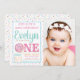 Primeira rosquinha de convites de festas de aniversários com rosquinha de aspersão rosa e cor-de-rosa fofinha e fundo de aspersão e espaço para fotos. Este convite de aniversário de rosquinha é facilmente personalizado para o seu evento adicionando a sua fotografia e os seus detalhes.
