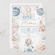 Rapaz Astronauta Blue Foto First Trip Around the Sun Birthday Invitation Outer O primeiro convite de aniversário para o menino que apresenta um astronauta no fundo e o sol no topo do design. Esta primeira viagem ao redor do convite de aniversário do sol também apresenta uma nave espacial e planetas, assim como uma foto no verso.