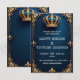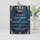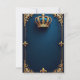 Elegante modelo de convite para casamento ao estilo real, com uma coroa ouro intricadamente desenhada, adornada com gemas de precioso no topo, colocada contra um rico fundo azul escuro com texturas sutis parecidas com veludo, rodeada por temas inspirados no ornamentado, como torres, arcos e flur-de-lis em filigre de ouro, com um toque de acentos brancos cremosos para evocar luxo e sofisticação, com amplo espaço para detalhes personalizados de casamento em uma fonte refinada, serif, com sutil contorno de ouro, e uma sutil fronteira de ouro para completar o olhar real, perfeito para uma celebração majestosa e opulente de casamento.