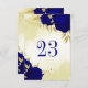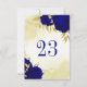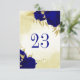 Belo cartão de número da mesa de casamento com flores azuis reais e folhas de ouro. São simulados os detalhes do brilho dourado. PARA MAIS PRODUTOS CORRESPONDENTES, consulte a coleção acima ou entre em contato comigo