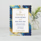 Este elegante convite para o casamento apresenta uma elegante folha de ouro azul e falso fundo marmoreado, com uma estrutura branca bordada em folha de ouro com uma palavra selecionada em dourado falso.