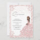 Um belo pincel cor-de-rosa e dourado-rosa, confete ilustrado como a convite de aniversário real ou princesa Quinceañera. "Quinceañera" está escrito em uma bela e delicada escrita à mão, num fundo de cor-de-rosa pincelado. Uma linda garota de um lindo vestido cor-de-rosa com faíscas de ouro rosa, joias e tiara aparece embaixo à direita, e o confete de ouro rosa cai do topo, e toda a cena é bordada por um quadro floral e brocado de ouro brilhante rosa. A parte de trás do convite contém uma broca cor-de-rosa-pincel e rosa de cerâmica. Que lindo! Copyright Elegant Invites, todos os direitos reservados.