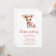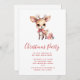 Convite de Natal com uma ilustração de um adorável veado bebê. Olhos grandes orelhas com cabeça grande e pequenos galhos castanhos. Vestindo um grande arco vermelho. Ao lado de uma pilha de presentes.