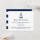 Convites de recepção temáticos náuticos com uma âncora em estilo vintage e um fundo listrado de azul-marinho e branco no verso.