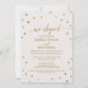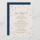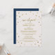 Este convite de recepção de casamento à fuga com bolinhas douradas é perfeito para uma festa de casamento à fuga elegante. O design simples apresenta confetes dourados chiques em um fundo de champanhe cremoso com bela caligrafia em folha dourada falsa e um verso azul-marinho. Cartões de RSVP são vendidos separadamente.