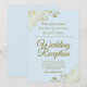 Este convite simples é projetado para convidados convidados para a recepção, mas não para a cerimônia de casamento em si. Ele apresenta um design elegante e sofisticado com letras em script dourado em um fundo azul claro e enrolamentos e espirais dourados ornamentados em cantos. Uma maneira linda de convidar seus amigos e familiares para celebrar com você!