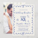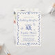 Convite de recepção de casamento romântico em creme claro com uma moldura ondulada azul francês adornada com laços coquetes, ilustrações caprichosas desenhadas à mão de um coração, estrelas e taças de vinho, e "Recepção de Casamento" e os nomes dos noivos em um script azul divertido. Adicione sua foto no verso.