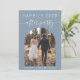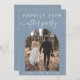 Moderno elopemento azul empoeirado ou pequeno anúncio de casamento e recepção / convite de festas. A frente apresenta sua foto em um quadro de arco inspirado no livro e "Felizmente, nunca depois da festa" em uma simples tipografia branca e um guião branco-chic com baloiços, seus primeiros nomes unidos por um coração e sua data de casamento ou recepção. No verso, personalize seus detalhes e adicione seus nomes em um script semelhante a assinatura.