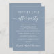 Moderno elopemento azul empoeirado ou anúncio privado de casamento e recepção de casamento ou convite de festas de celebração. "Felizmente, nunca depois da festa" é escrito em uma mistura de uma simples tipografia branca e uma escrita na moda branca com pestanas. Personalize seu anúncio de casamento e seu convite de recepção e adicione seus nomes em um script semelhante a assinatura. No verso, introduza o endereço URL do Web site do casamento para criar um Código QR para os convidados procurarem todos os detalhes e para RSVP online, e adicione os seus primeiros nomes e datas de casamento e de recepção.