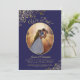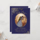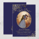 Este convite de recepção de casamento ou festa após o casamento apresenta um título elegante em letra cursiva que diz "Nós Fizemos!". Tem um design simples, mas elegante, com letras douradas em letra cursiva em um fundo azul marinho, e sua foto em uma moldura oval rodeada por babados de renda dourada falsa. Perfeito para casamentos secretos ou celebrações que acontecem após uma cerimônia privada. Uma ótima maneira de convidar familiares e amigos para celebrar seu amor.