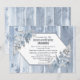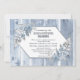 Um convite de recepção pós-casamento em madeira azul poeirento elegante, apresentando um fundo de madeira azul desbotado, folhas de samambaia e margaridas seguradas por uma simples armação de arame com brilho falso.