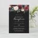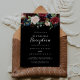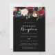 Este convite de recepção de casamento botânico preto rústico é perfeito para uma festa clássica pós-casamento secreto. O design apresenta flores radiantes e graciosas pintadas à mão em burgundy, vermelho, azul-marinho, azul e blush em um fundo preto, inspirando beleza natural.