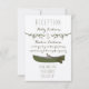 Um cartão de recepção de casamento rústico com uma ilustração de ramos de sempre-verde. Canoa verde na parte inferior.